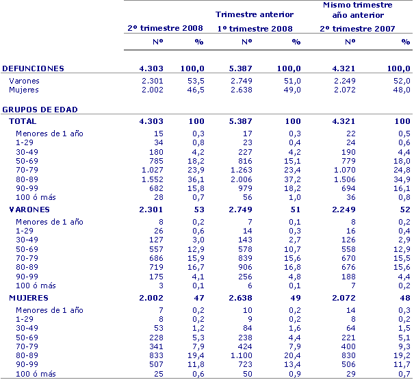 En el segundo trimestre de 2008 fallecieron en la C.A. de Euskadi 4.303 personas, un 0,4% menos que en el mismo período del año anterior, según datos de EUSTAT. Por territorios, en Álava fallecieron 531 personas, con una disminución del 1,8%, 2.341 en Bizkaia (-0,9%), mientras que Gipuzkoa, con 1.431, fue el único territorio donde aumentaron los fallecimientos (+0,9%).