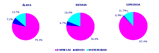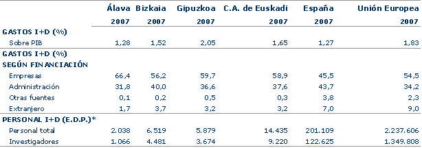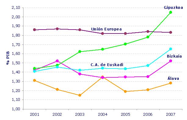 El esfuerzo realizado por Gipuzkoa en 2007 queda reflejado en la comparación del gasto interno en I+D como porcentaje del PIB, que alcanzó la cifra de 2,05%, superando por primera vez la media europea de la UE-27 (1,83%), según datos elaborados por Eustat. Este indicador alcanzó en Bizkaia el 1,52% y en Álava el 1,28%, siendo en los tres territorios superior a la media española (1,27%).