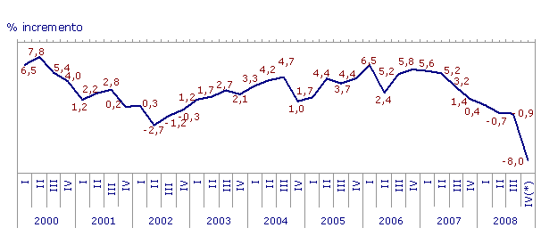 Las variaciones intermensuales en el mes de noviembre de 2008, sobre octubre de 2008, han sido también negativas excepto en el caso de la Energía, que permanece invariable (0,0%). Los Bienes de equipo bajan un 4,3%, los Bienes intermedios descienden un 3,1% y los Bienes de consumo disminuyen un 1,4%, como consecuencia del descenso experimentado tanto por los Bienes de consumo duradero (-1,3%), como por los Bienes de consumo no duradero (-1,4%).
