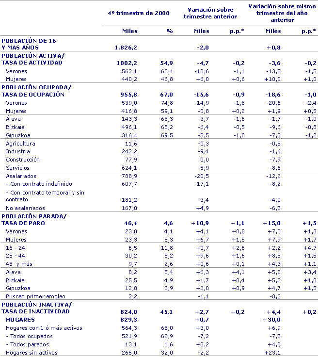 Los datos del cuarto trimestre de 2008 ofrecen una tasa de paro del 4,6%, 1,1 puntos porcentuales más que el trimestre anterior. La tasa de paro masculina sube al 4,1% (0,8 puntos porcentuales más) y la femenina sube 1,5 puntos, situándose en el 5,3%. La tasa de paro juvenil sigue siendo la más alta con el 11,8%, aumentando en 2,6 puntos, afectando el desempleo a 6.500 jóvenes activos de 16 a 24 años.