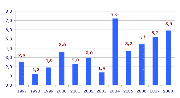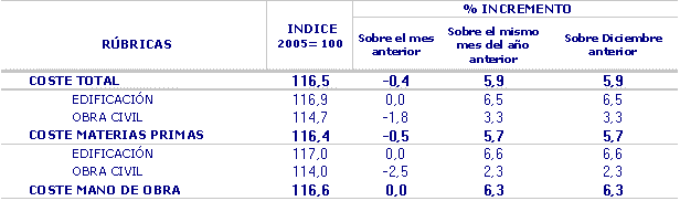 Entre los precios de las materias primas consumidas por el sector que han experimentado mayores tasas de inflación a lo largo de 2008 figuran: Energía eléctrica y gas (14,4%), Minerales metálicos y no metálicos (13,1%), Agua (11,4%) e Industria química (6,8%). En sentido contrario, han registrado reducciones en sus precios anuales (diciembre de 2008 sobre diciembre de 2007), las materias primas de Refino de petróleo (-21,6%) y Material electrónico (-3,2%).