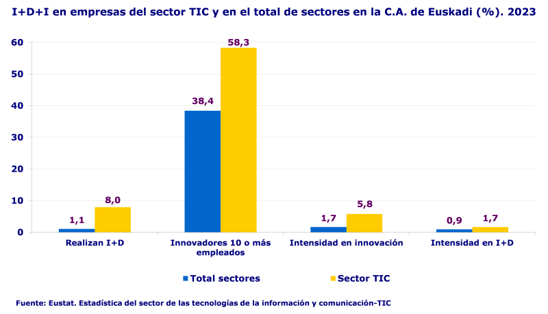 El sector TIC, que sólo constituye el 1,9% del total de las empresas de la C.A. de Euskadi, reúne sin embargo al 14,9% de las empresas que realizan I+D y ejecuta, con 138,9 millones de euros, el 9,0% del total del gasto en I+D interna del sector empresarial.
