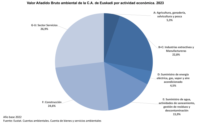 En la distribución por sectores económicos del VAB ambiental, en 2023, destacó la aportación del sector Servicios, con el 26,9%, seguido de la Construcción, con el 24,6%, las Industrias extractivas y Manufactureras, con el 22,8%, las actividades de Suministro de agua, saneamiento y gestión de residuos, con el 15,9% y, finalmente, los sectores de la Agricultura, ganadería, silvicultura y pesca y Suministro de energía eléctrica, gas, vapor y aire, con un 5,3% y 4,5% respectivamente.