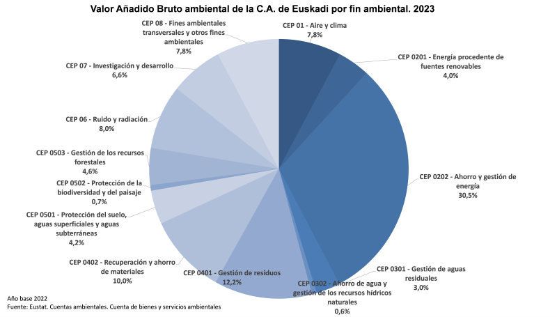 El fin ambiental que destacó por su mayor peso en el VAB ambiental en 2023 fue el Ahorro y gestión de energía, con el 30,5% del total. Le siguieron, con el 12,2%, la Gestión de residuos; y, con el 10,0%, la Recuperación y ahorro de materiales. Otros fines ambientales con contribución importante (superior al 5,0%) a la composición del VAB ambiental fueron: la protección contra el Ruido y las radiaciones (8,0% del VAB ambiental total); la reducción y control de emisiones que afectan al Aire y clima y Otros fines ambientales trasversales, ambos fines representando el 7,8% del VAB ambiental y la I+D ambiental, con el 6,6% del VAB ambiental total en 2023.