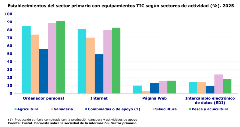 A pesar de esta mejora en los equipamientos TIC, el sector primario está aún alejado del resto de sectores de la economía vasca en 2025 donde, de media, la disponibilidad de ordenadores, 95,8 %, o el acceso a Internet, 95,5 %, sigue siendo superior.