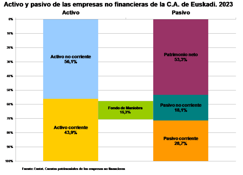 En 2023 el activo corriente de las empresas no financieras decrece un 0,4 %, siendo el descenso del activo total de un 3,2 %