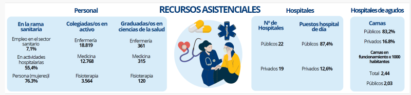 El personal empleado en actividades sanitarias, que asciende a 67.315 en el año 2024, supone un 7,1 % del empleo total. Este empleo ha crecido un 8,4 % respecto a 2020, dedicándose la mayoría a actividades hospitalarias (55,4 %). Respecto a los recursos humanos en la asistencia sanitaria, la presencia de la mujer es mayoritaria en las profesiones del ámbito de la salud (76,3 %).