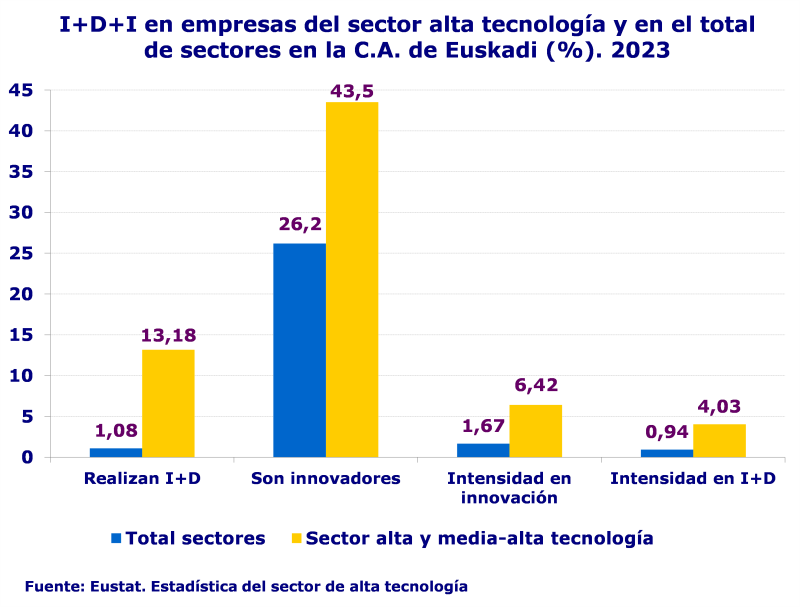 En el sector de la alta tecnología, el 13,2% de sus empresas realiza actividades de I+D, porcentaje muy superior al que se da para el conjunto de los sectores (1,1%). Además, este sector reúne al 44,2% de las que realizan I+D en el sector empresa y ejecuta, con 1.158,2 millones de euros, el 74,9% del gasto en I+D interno ejecutado por el sector empresarial o el 57,8% de lo gastado por todos los sectores.